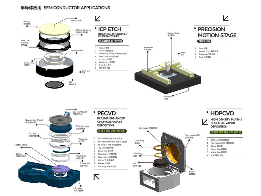 卓瓷科技成立于2021年,专注于泛半导体领域陶瓷部件研发与生产,是当前该领域的明星创业企业。其产品已进入华为等国内一流厂商,广泛应用于半导体、显示面板设备等,半导体业务占比约80%。