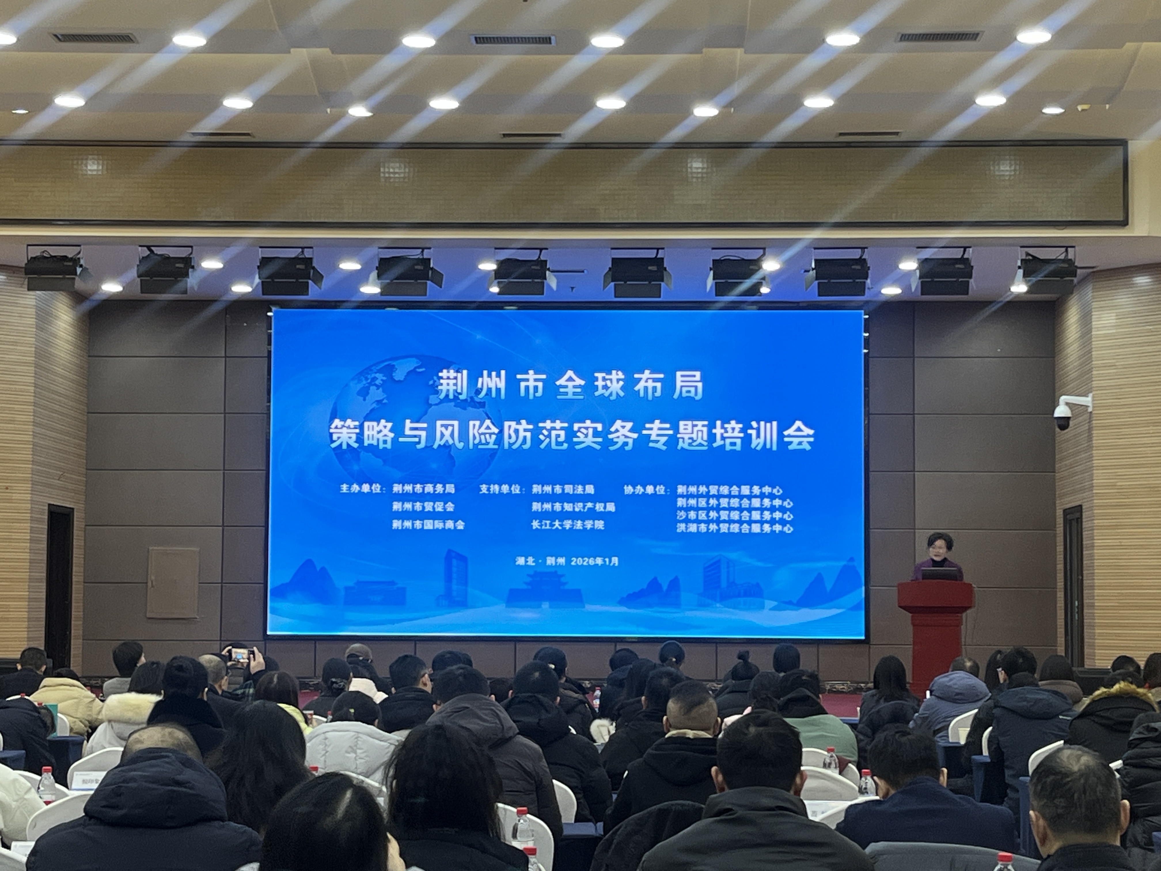 1月22日,我市举办荆州市全球布局策略与风险防范实务专题培训会。本次培训会吸引160名企业和服务机构代表参加,旨在通过系统性的政策解读与实务指导,助力企业把握国际市场机遇,有效防范跨境经营风险。