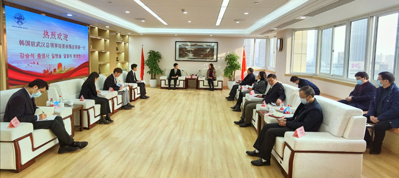 韩国驻汉总领馆郑中燮领事,我会办公室、对外联络部、会务信息部、国际展览部、法律事务部负责人参加会谈。