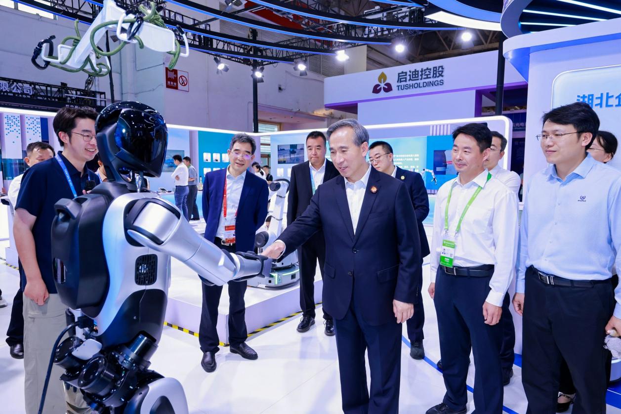7 月 17 日下午,中国贸促会会长任鸿斌巡视第三届链博会湖北人形机器人产业链专题展区,调研走访多家湖北人形机器人企业,听取企业展品功能、场景应用、产业化进展情况介绍,并现场与鄂产人形机器人互动。