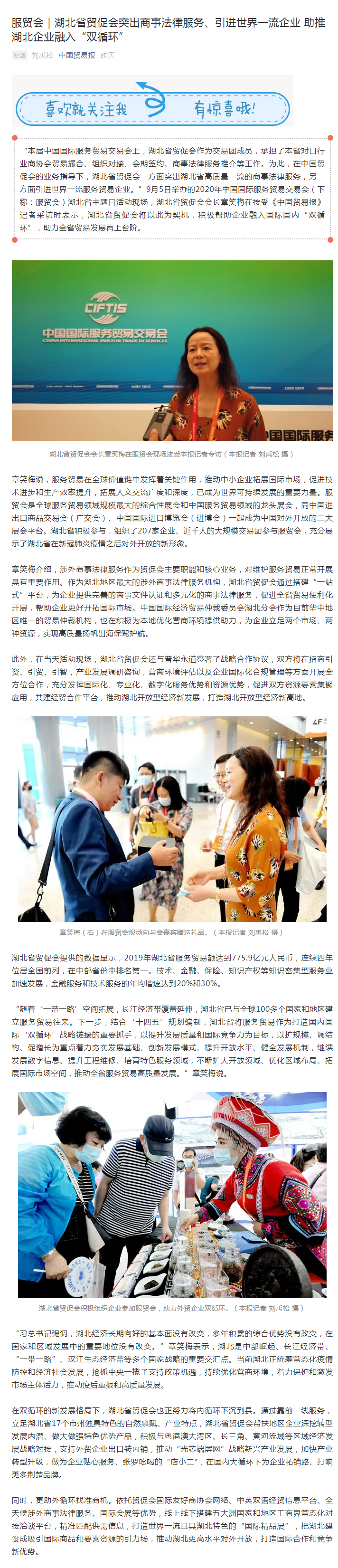 中国贸易报微信公众号:服贸会|湖北省贸促会突出商事法律服务、引进世界一流企业 助推湖北企业融入“双循环”