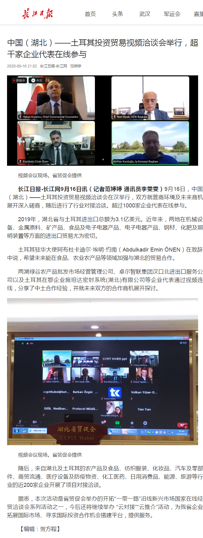 长江网:中国(湖北)——土耳其投资贸易视频洽谈会举行,超千家企业代表在线参与