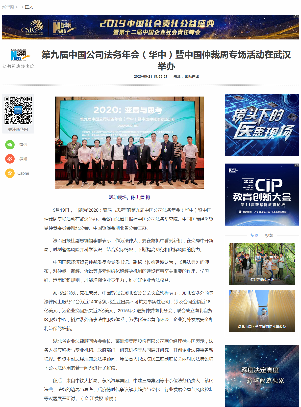 新华网:第九届中国公司法务年会(华中)暨中国仲裁周专场活动在武汉举办