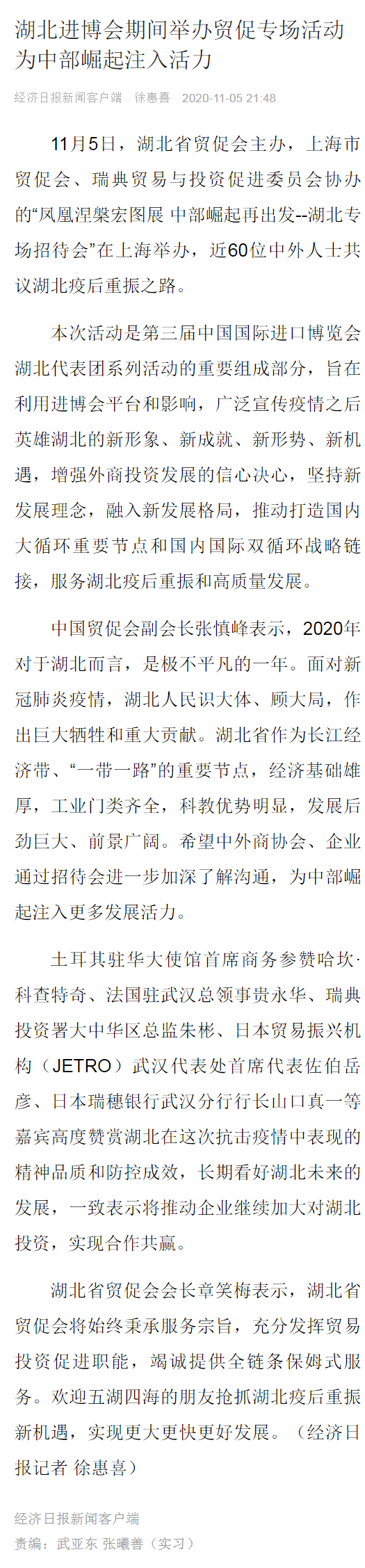 经济日报:湖北进博会期间举办贸促专场活动 为中部崛起注入活力
