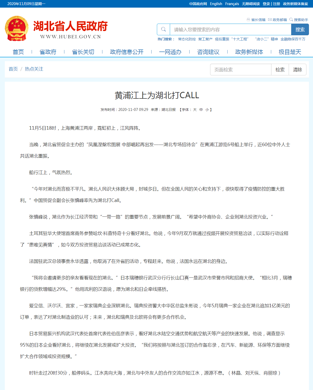 湖北省人民政府门户网:黄浦江上为湖北打CALL