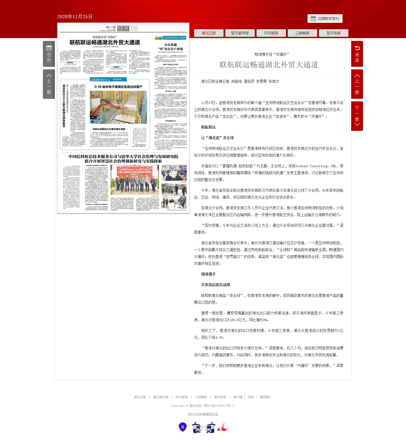 湖北日报:鄂港携手促“双循环” 联航联运畅通湖北外贸大通道