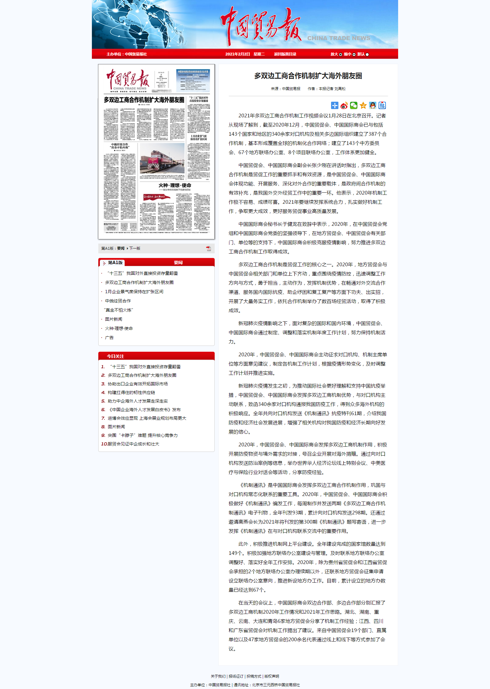 中国贸易报:多双边工商合作机制扩大海外朋友圈