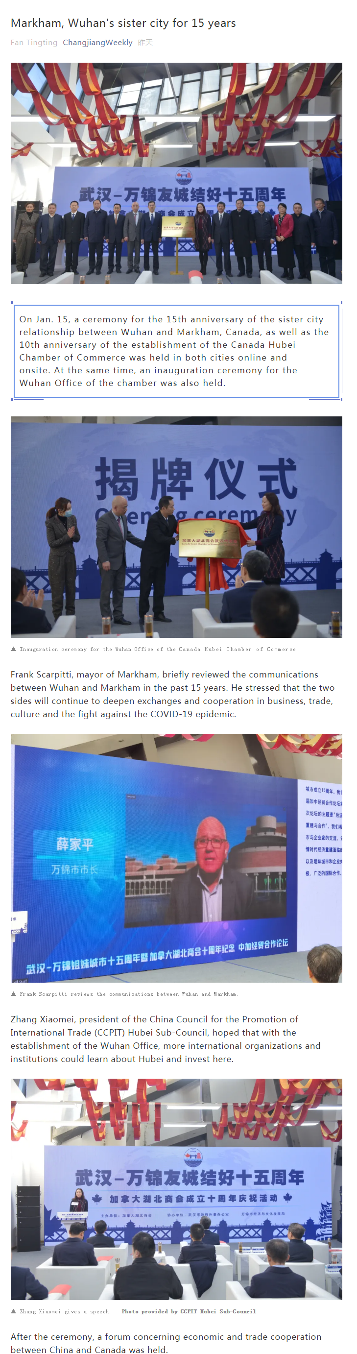 长江周刊:Markham, Wuhan's sister city for 15 years