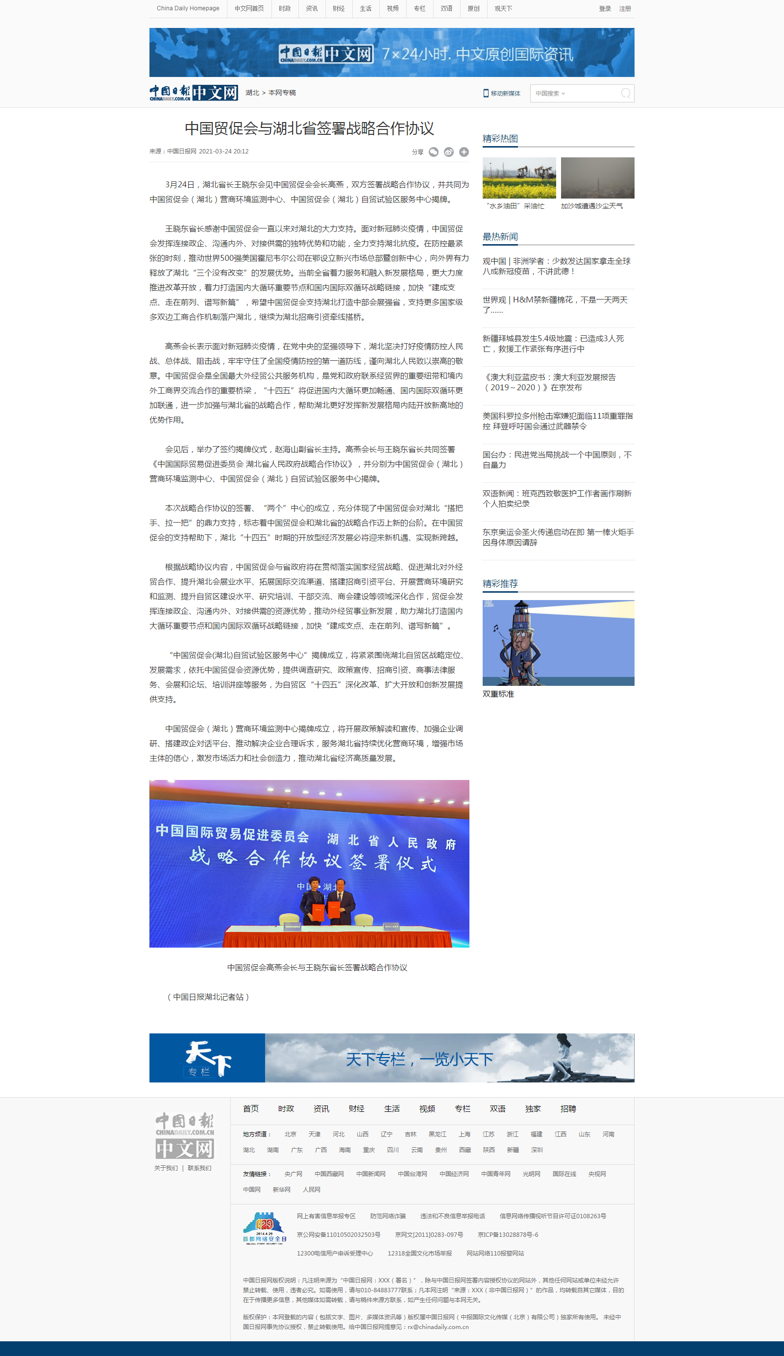 中国日报:中国贸促会与湖北省签署战略合作协议