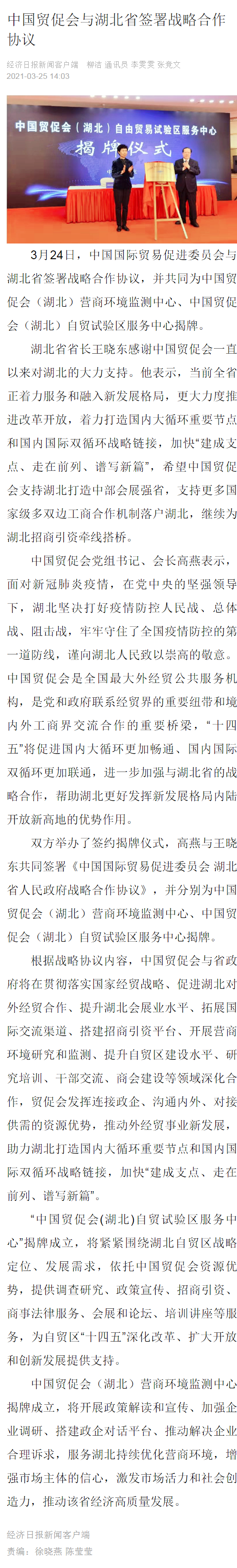 经济日报:中国贸促会与湖北省签署战略合作协议
