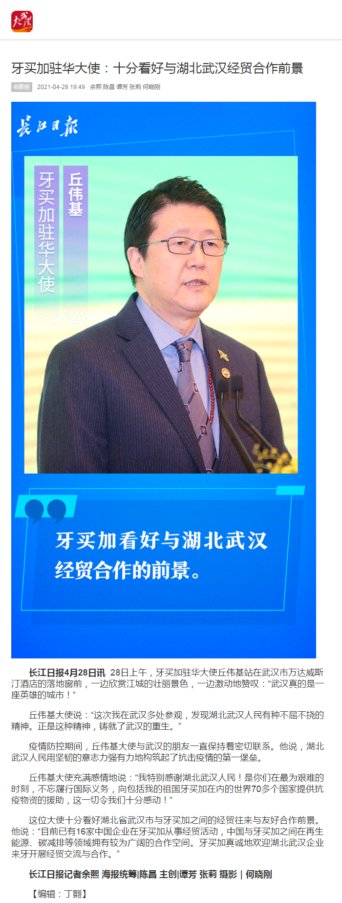 长江日报:牙买加驻华大使:十分看好与湖北武汉经贸合作前景