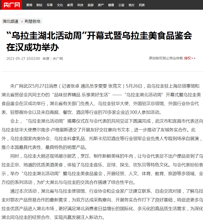 央广网:“乌拉圭湖北活动周”开幕式暨乌拉圭美食品鉴会在汉成功举办