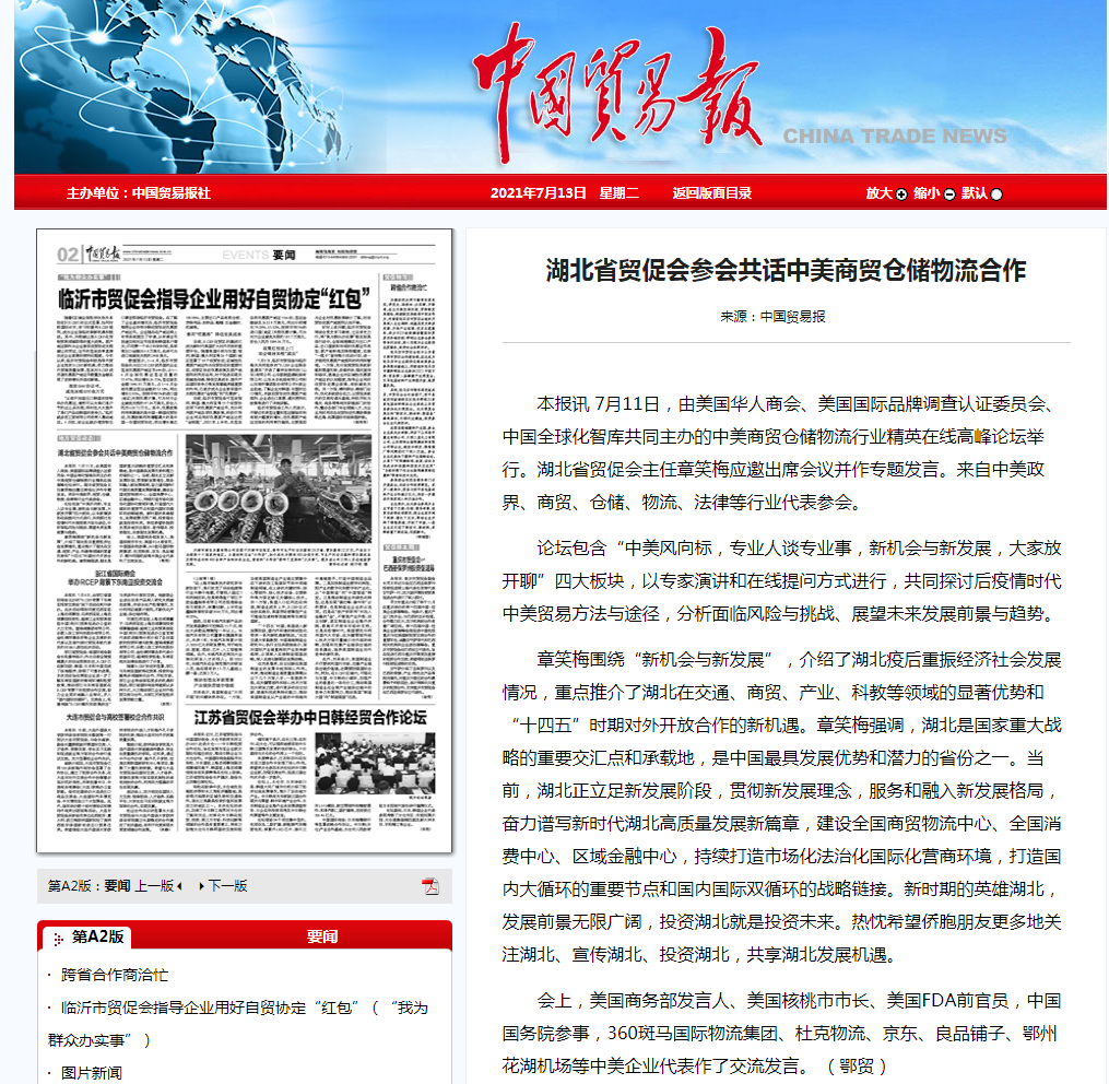 中国贸易报:湖北省贸促会参会共话中美商贸仓储物流合作