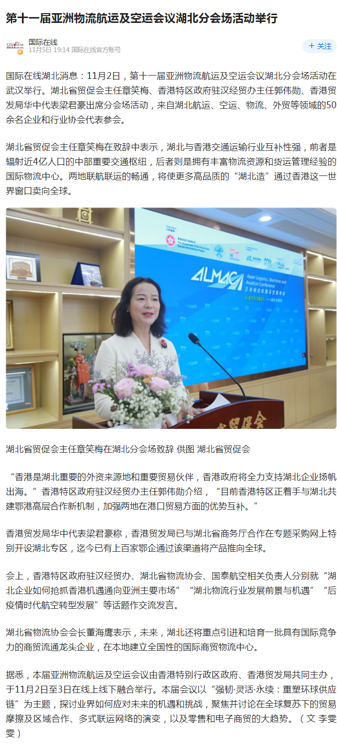 中央广电总台国际在线:第十一届亚洲物流航运及空运会议湖北分会场活动举行