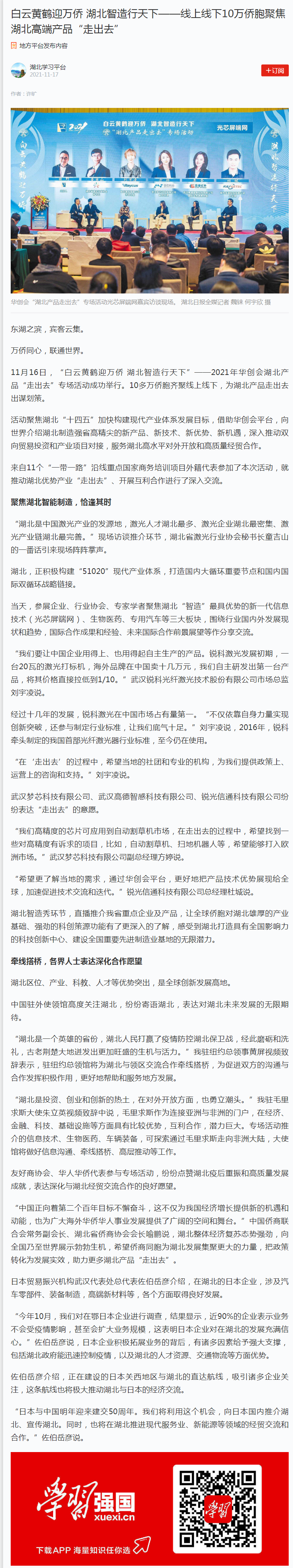 学习强国:白云黄鹤迎万侨 湖北智造行天下——线上线下10万侨胞聚焦湖北高端产品“走出去”