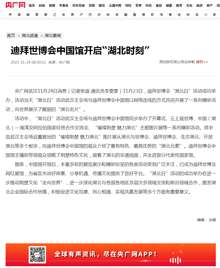 央广网:迪拜世博会中国馆开启“湖北时刻”