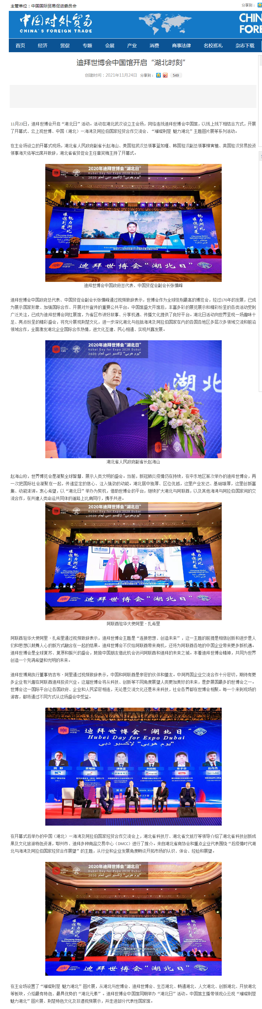 中国对外贸易:迪拜世博会中国馆开启“湖北时刻”