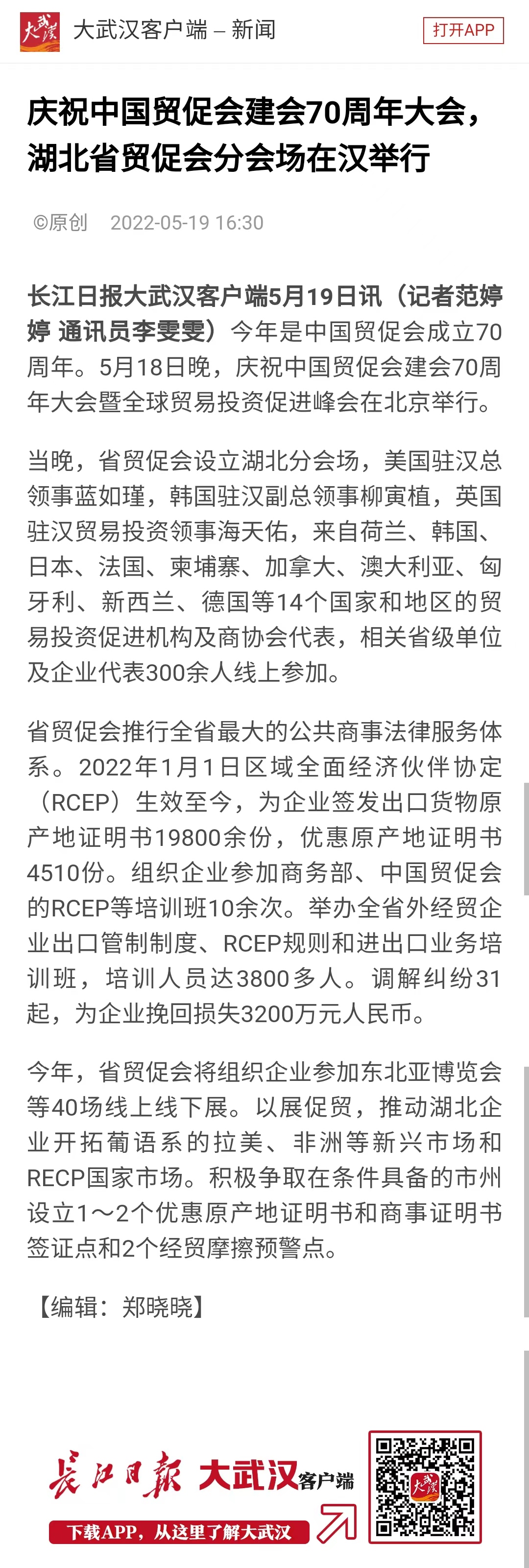 长江日报:庆祝中国贸促会建会70周年大会,湖北省贸促会分会场在汉举行
