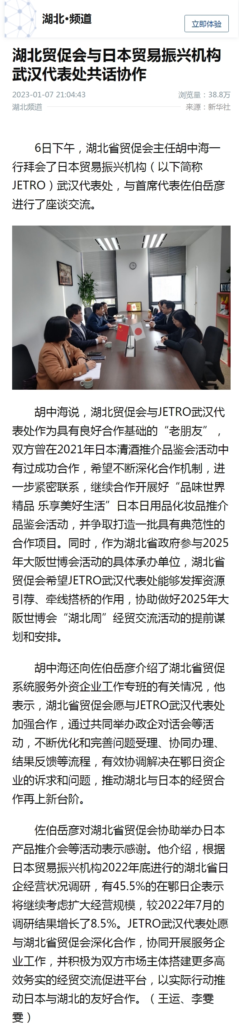新华社:湖北贸促会与日本贸易振兴机构武汉代表处共话协作