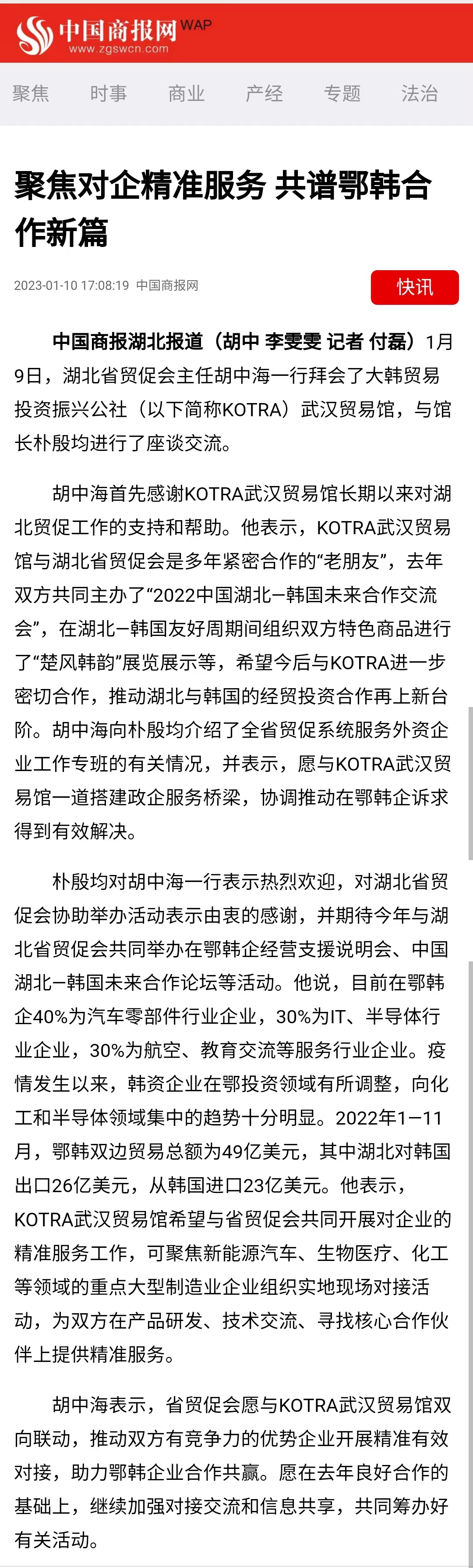 中国商报:聚焦对企精准服务 共谱鄂韩合作新篇