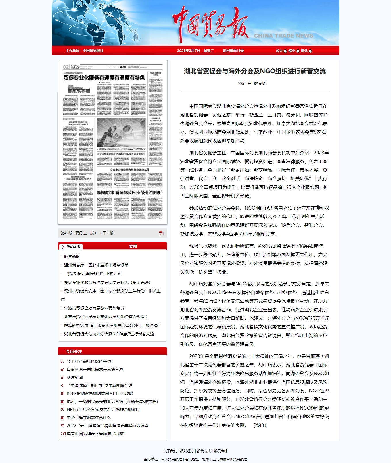 中国贸易报:湖北省贸促会与海外分会及NGO组织进行新春交流