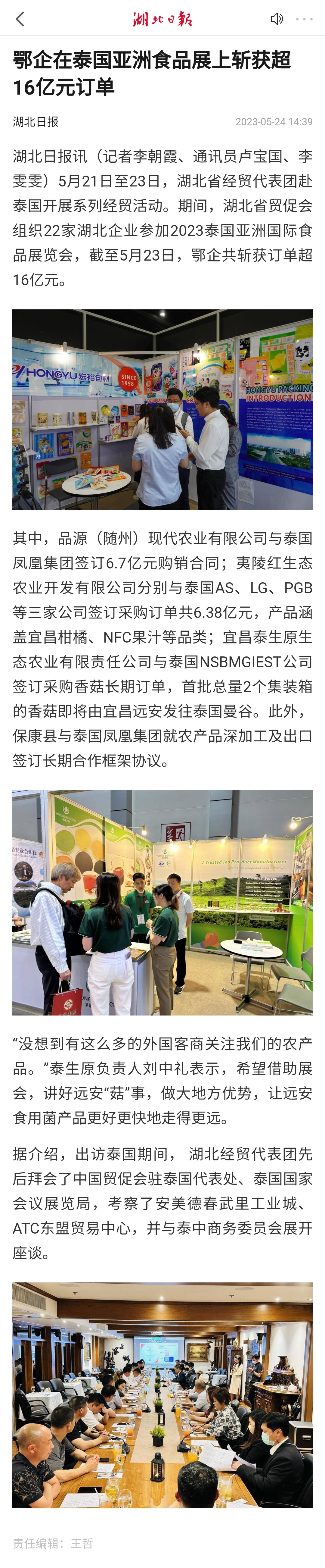 湖北日报:鄂企在泰国亚洲食品展上斩获超16亿元订单