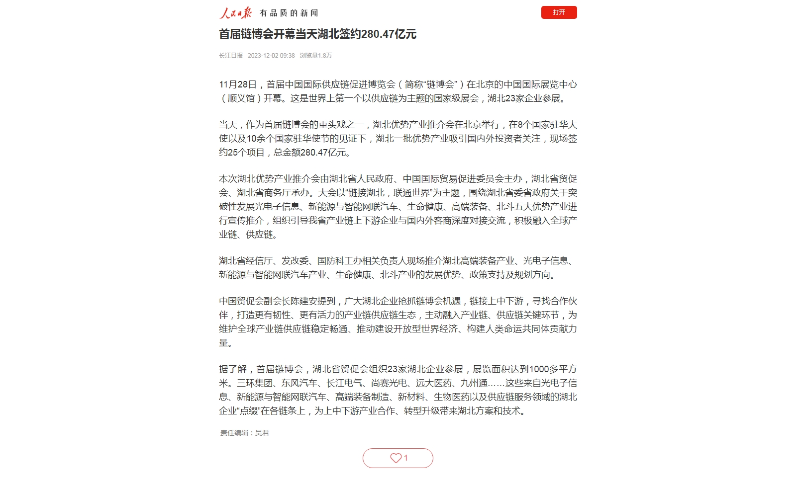 人民日报:首届链博会开幕当天湖北签约280.47亿元