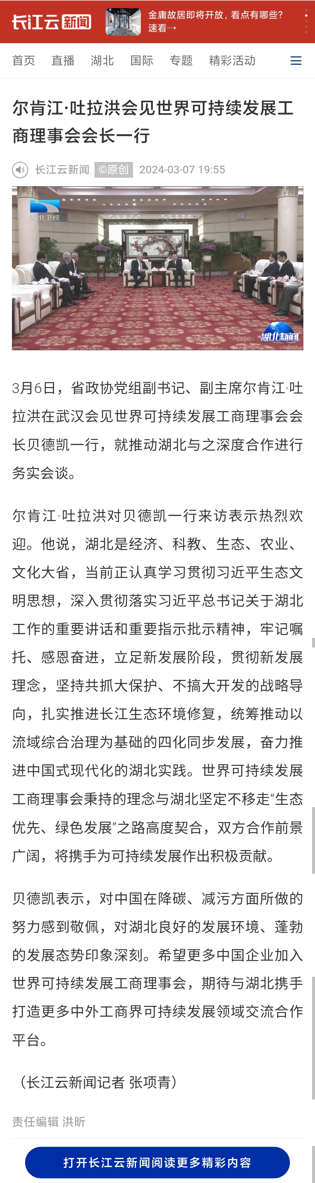 湖北卫视:尔肯江·吐拉洪会见世界可持续发展工商理事会会长一行
