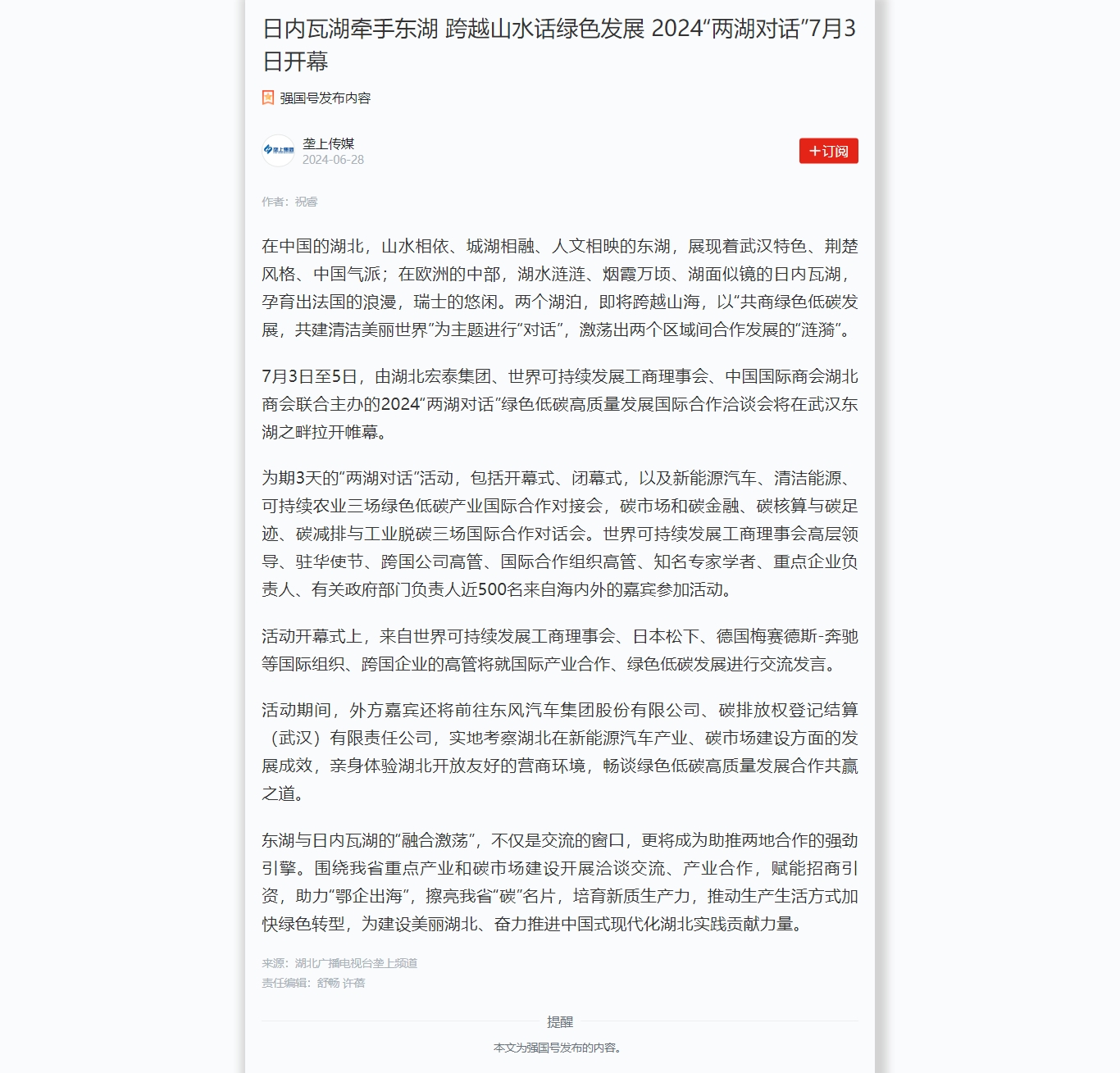 学习强国:日内瓦湖牵手东湖 跨越山水话绿色发展 2024“两湖对话”7月3日开幕
