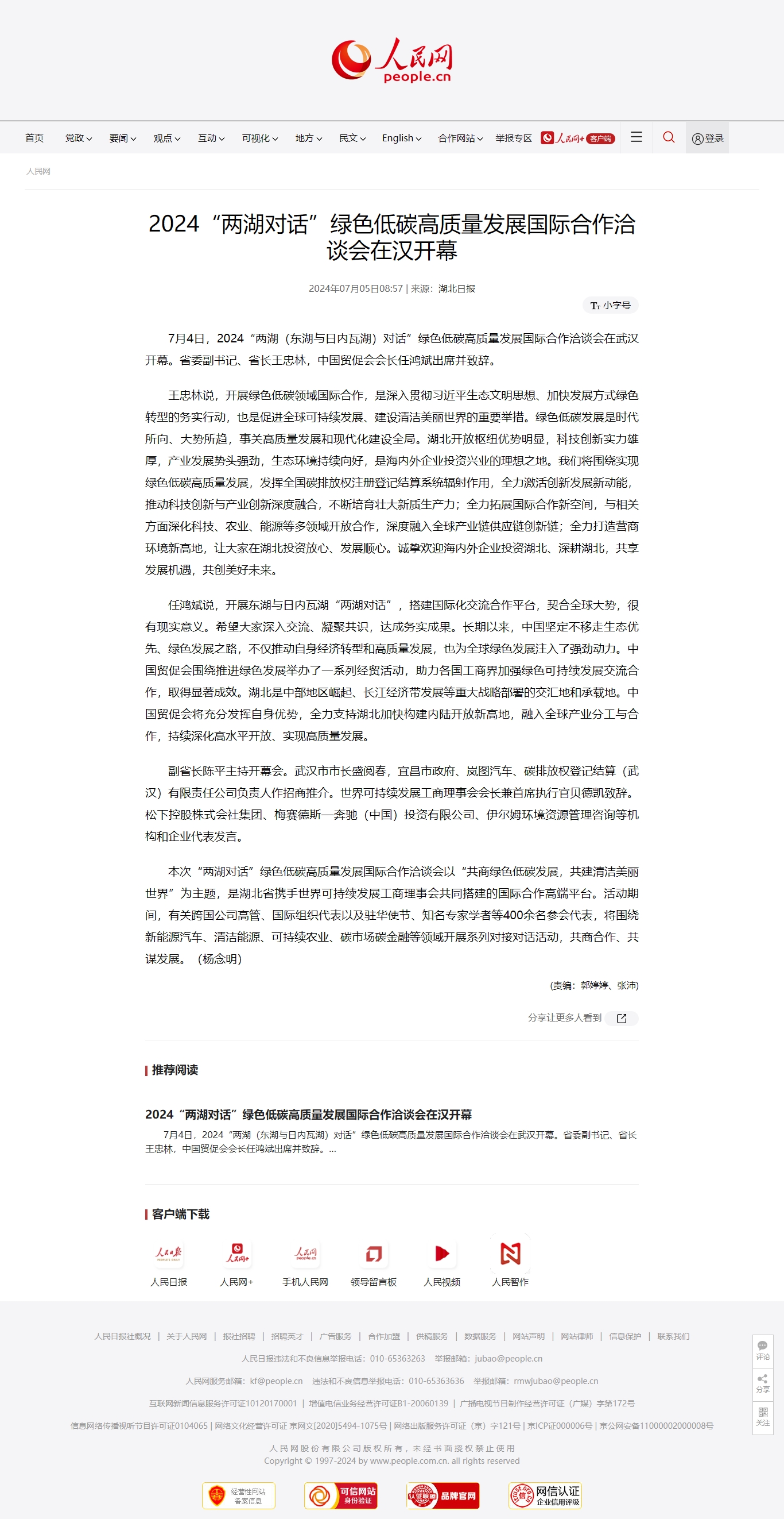 人民日报:2024“两湖对话”绿色低碳高质量发展国际合作洽谈会在汉开幕