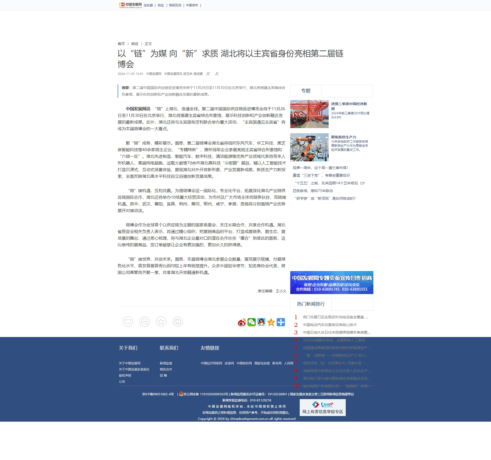 中国发展网:以“链”为媒 向“新”求质 湖北将以主宾省身份亮相第二届链博会