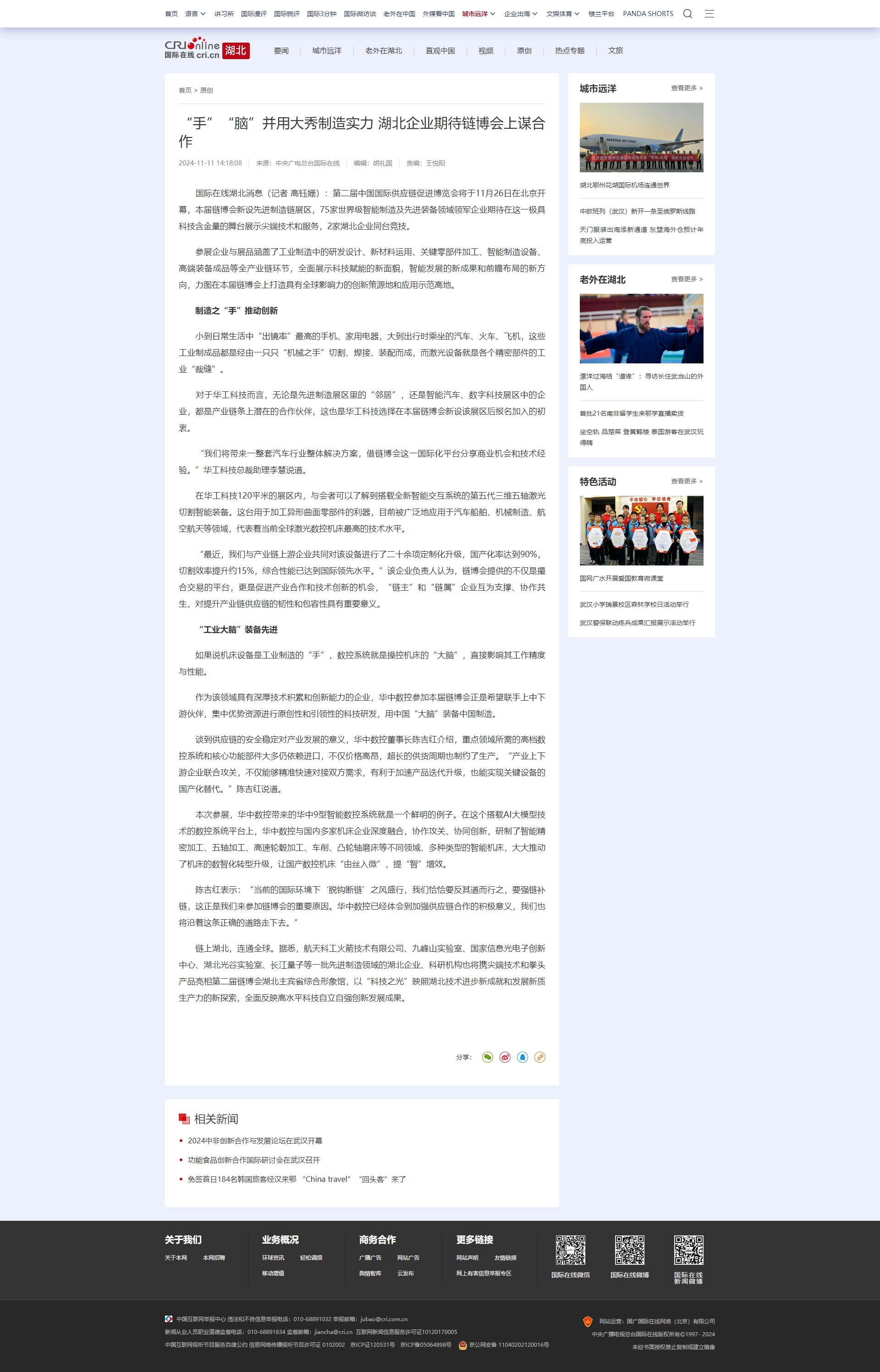 国际在线:“手”“脑”并用大秀制造实力 湖北企业期待链博会上谋合作