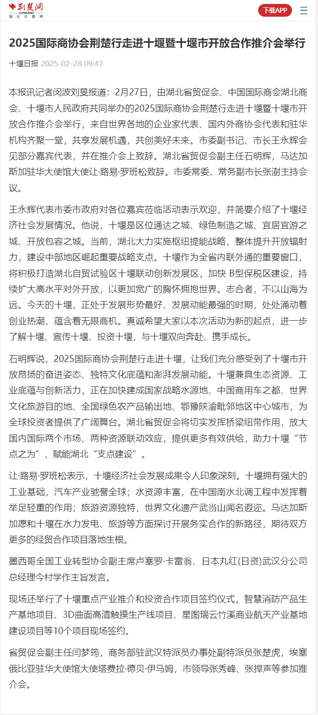 荆楚网:2025国际商协会荆楚行走进十堰暨十堰市开放合作推介会举行