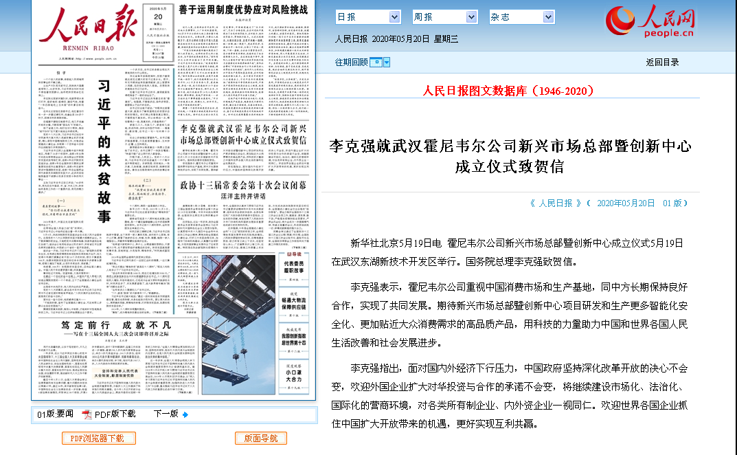 人民日报:李克强就武汉霍尼韦尔公司新兴市场总部暨创新中心成立仪式致贺信