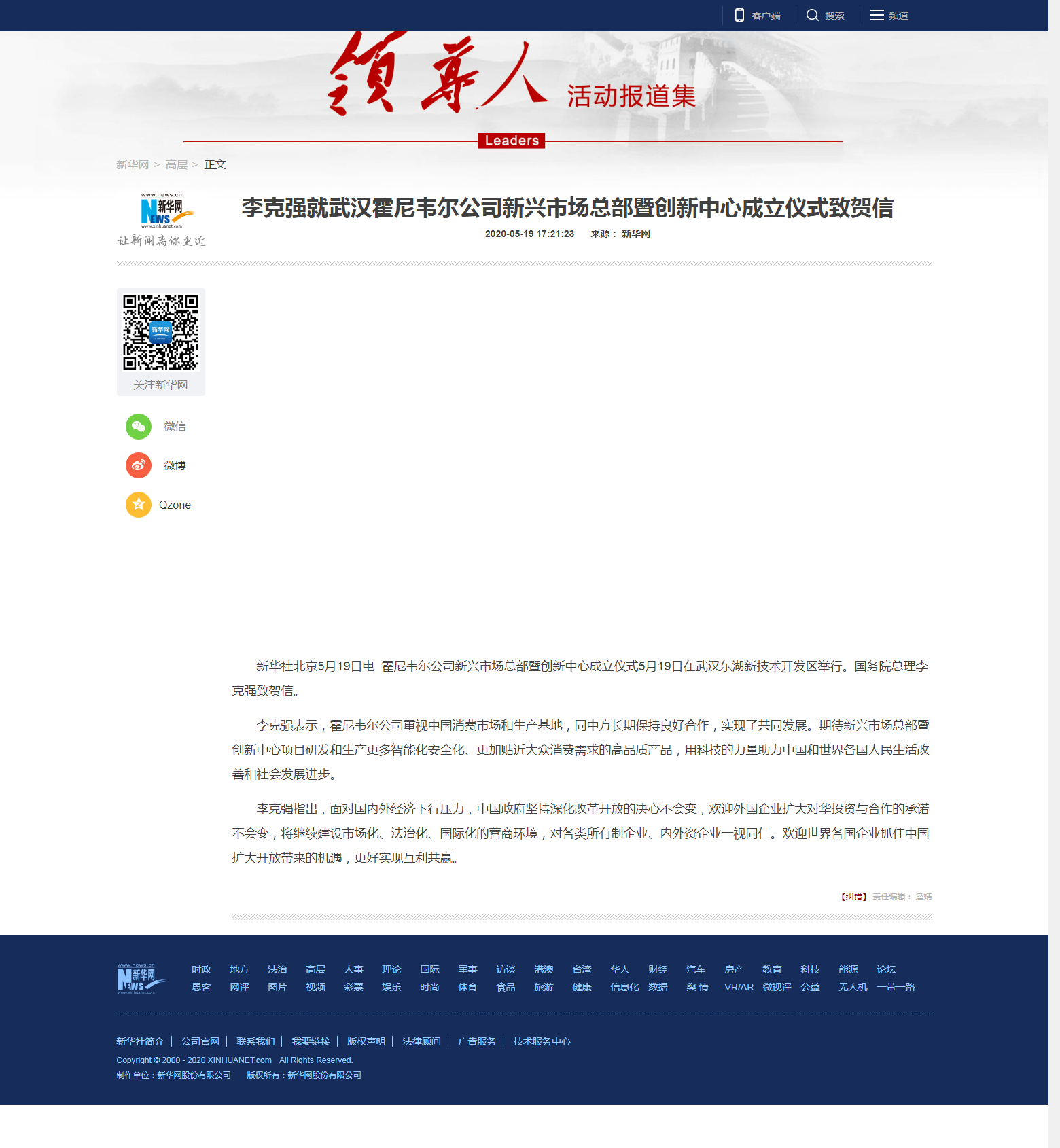 新华网:李克强就武汉霍尼韦尔公司新兴市场总部暨创新中心成立仪式致贺信