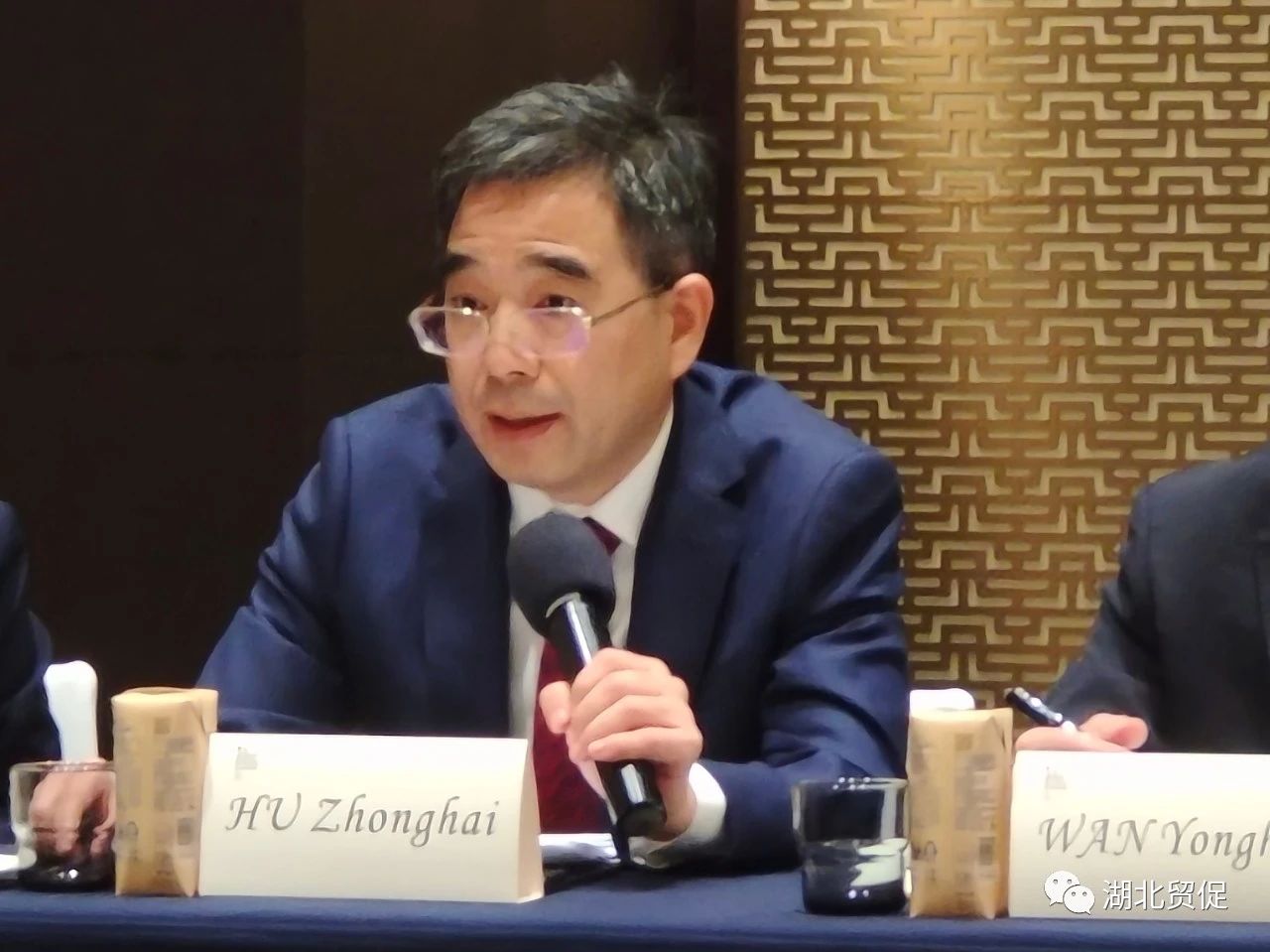 10月10日下午,由法国驻武汉领事馆主办的在鄂法企经济座谈会在武汉举行。法国驻武汉总领事胡建谊(Jean-Yves ROUX)主持,法国驻华大使白玉堂(Bertrand LORTHOLARY)、法国驻华大使馆区域经济处公使衔参赞江天(Christian GIANELLA)和中国法国工商会主席乐睿思 (Christophe Lauras)出席会议并致辞。我会胡中海主任应邀出席座谈会并致辞。