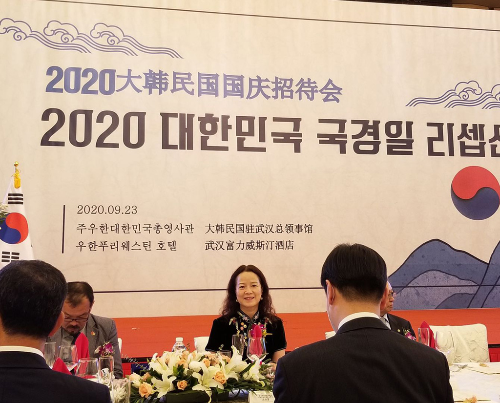 9月23日,章笑梅会长受邀出席2020大韩民国国庆招待会,并与韩国政府官员、商协会负责人和韩企代表就深化鄂韩合作广泛交流。