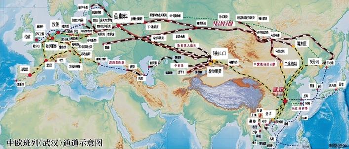摊开中欧班列(武汉)通道示意图,一张联通欧洲、覆盖中亚、衔接日韩、连接东盟的国际多式联运服务网络跃然眼前。密密麻麻的运输线路上,一列列“钢铁驼队”穿山越海,成为具有强大辐射力、带动力和影响力的国际物流品牌的重要支撑。