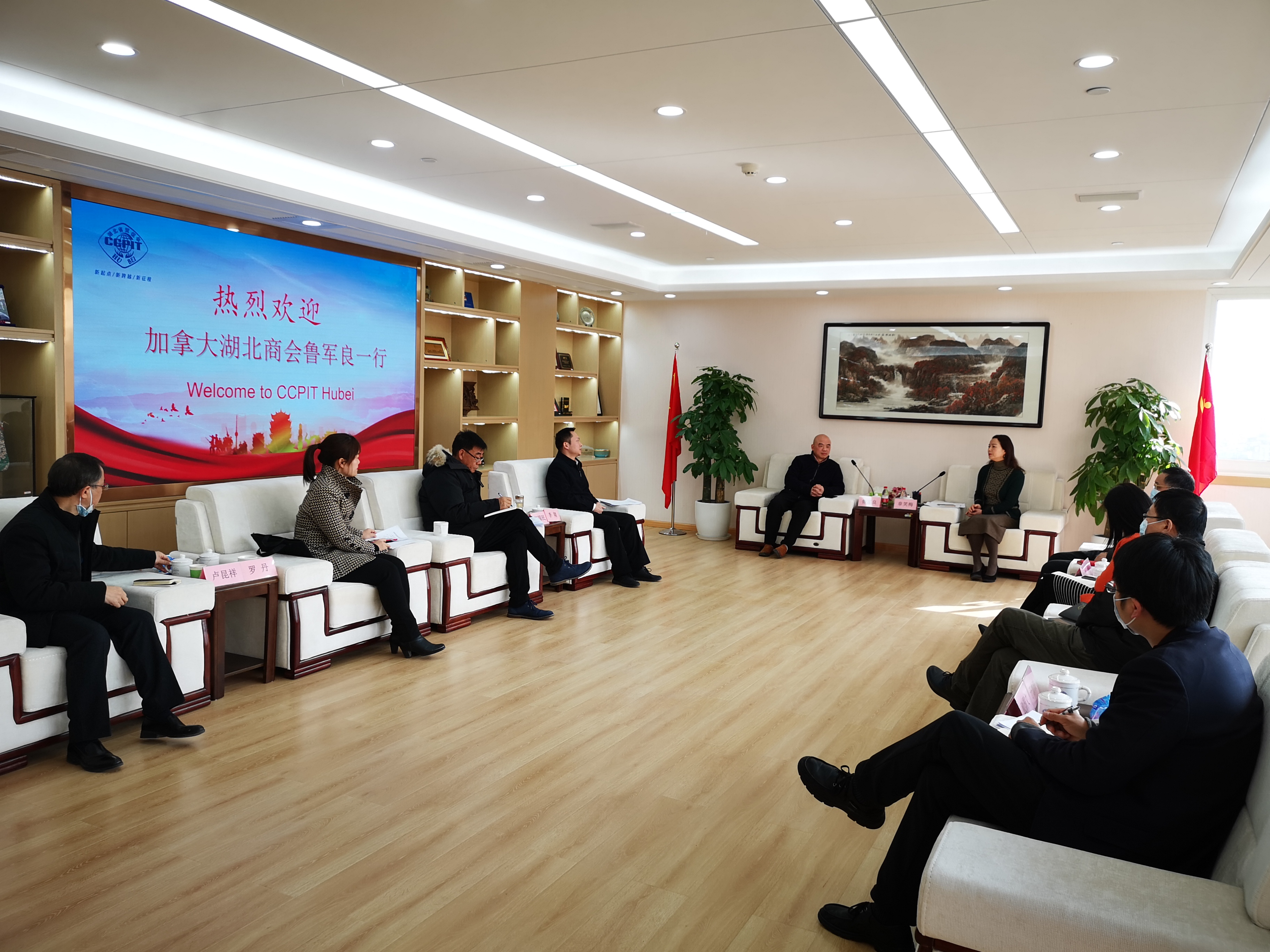 鲁军良代表表示,加拿大湖北商会将在湖北设立武汉代表处,特申请我会担任其业务主管单位。同时介绍了加拿大湖北商会成立十周年相关活动筹备情况,邀请章笑梅会长出席并致辞,以及将继续推动长江新城枫叶小镇、万锦大道项目建设等情况。