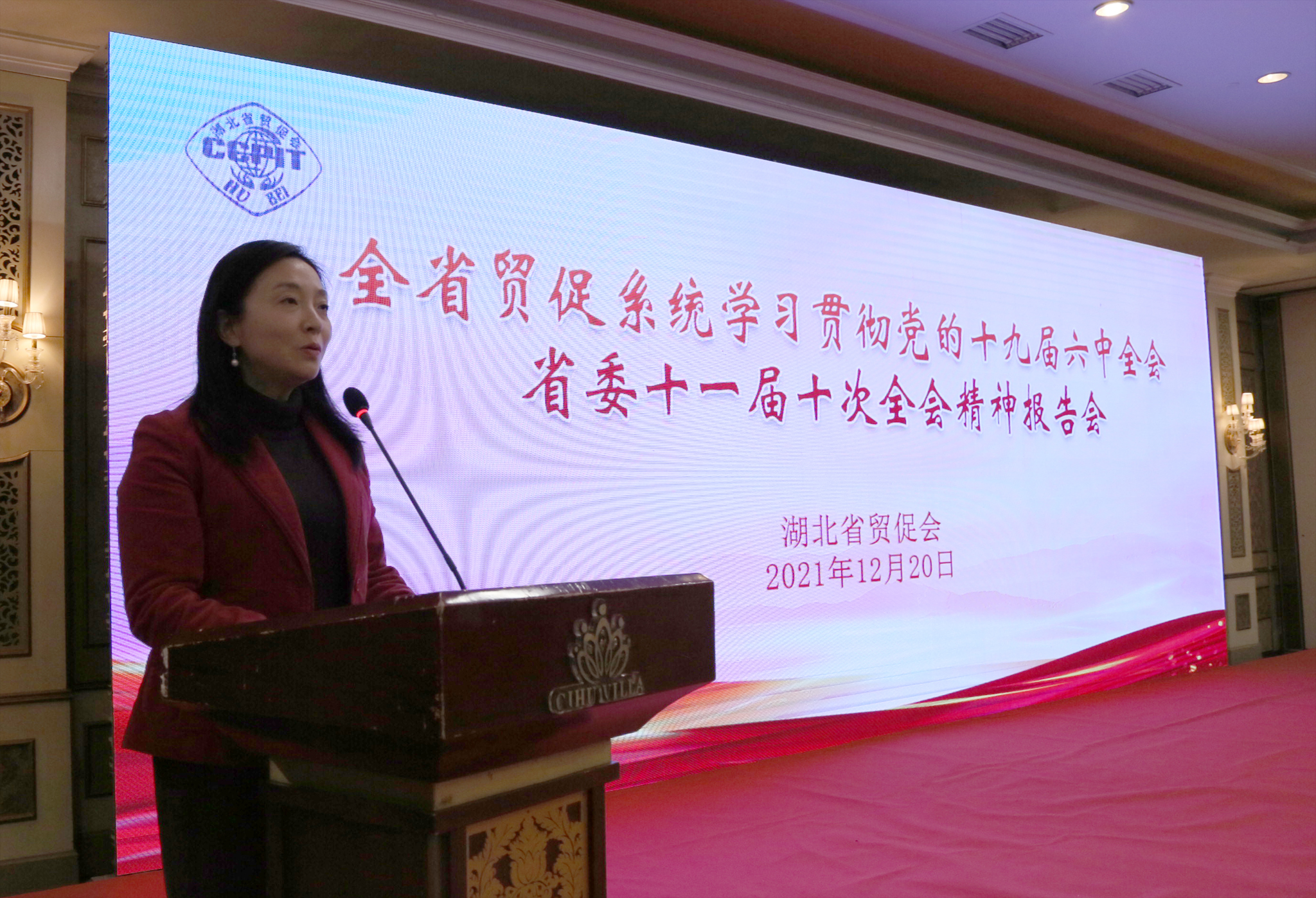 12月20日,全省贸促工作会议在黄石召开。会上,举办了全省贸促系统学习贯彻党的十九届六中全会、省委十一届十次全会精神报告会,章笑梅主任作工作报告,总结2021年全省贸促工作,部署2022年重点任务,李晓燕副主任主持会议。