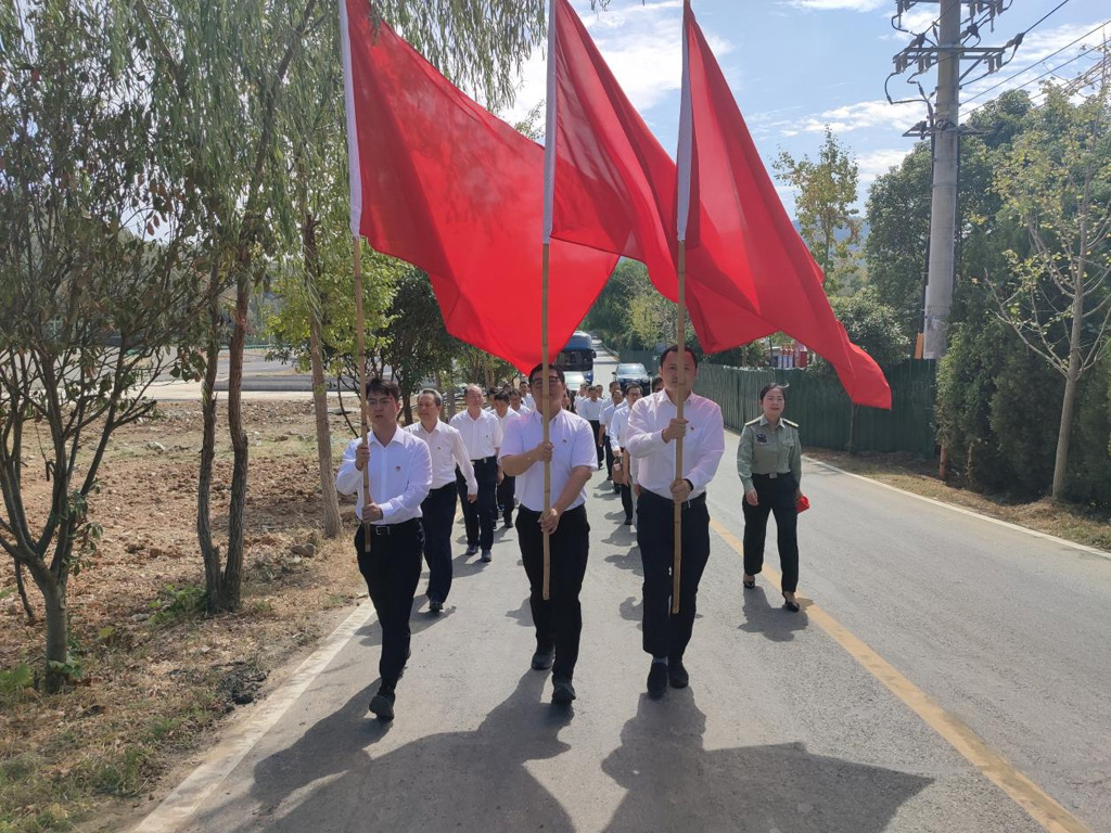 初秋的九口堰,天空湛蓝、银杏初黄、红旗飘扬。党建活动开始前,首先举行了简短的授旗仪式,三家单位的党员干部职工身着正装、胸配党徽,在革命纪念馆门前整齐列队,纪念馆领导向三家单位旗手授旗。在红旗的指引下,伴随着嘹亮的红歌,全体人员精神抖擞,踏上了先辈们走过的抗战之路。