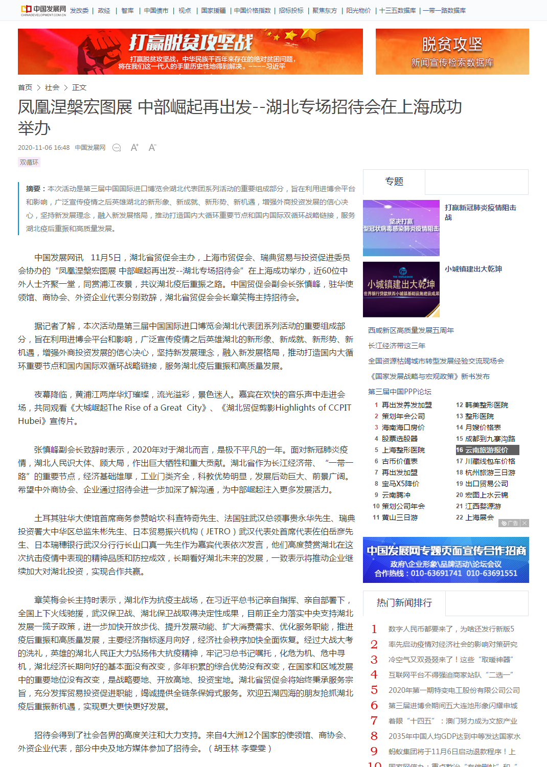 中国经济导报/中国发展网:凤凰涅槃宏图展 中部崛起再出发--湖北专场招待会在上海成功举办
