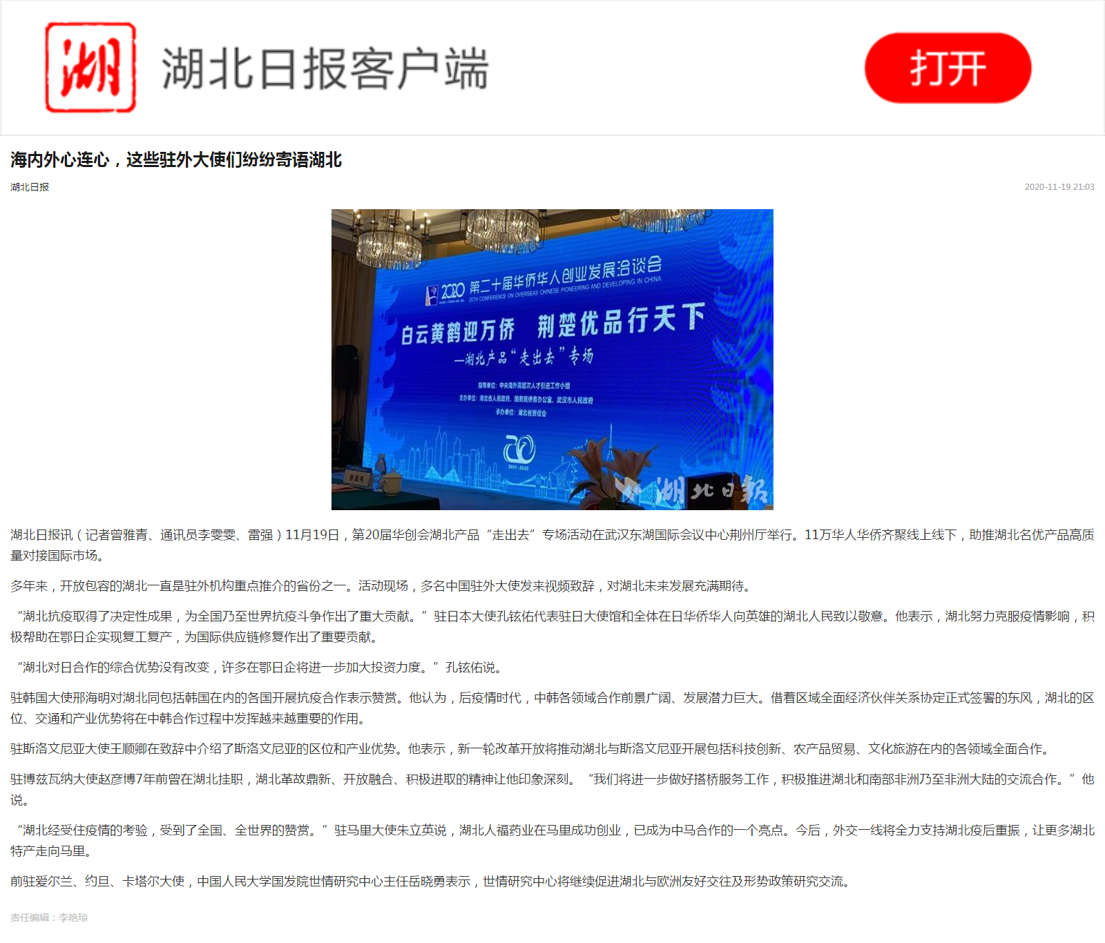湖北日报:海内外心连心,这些驻外大使们纷纷寄语湖北
