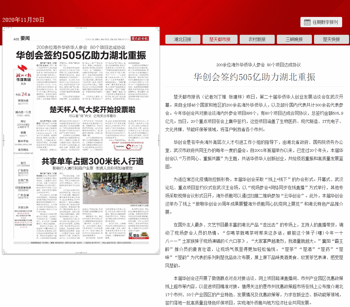 楚天都市报:200余位海外华侨华人参会 80个项目达成协议 华创会签约505亿助力湖北重振