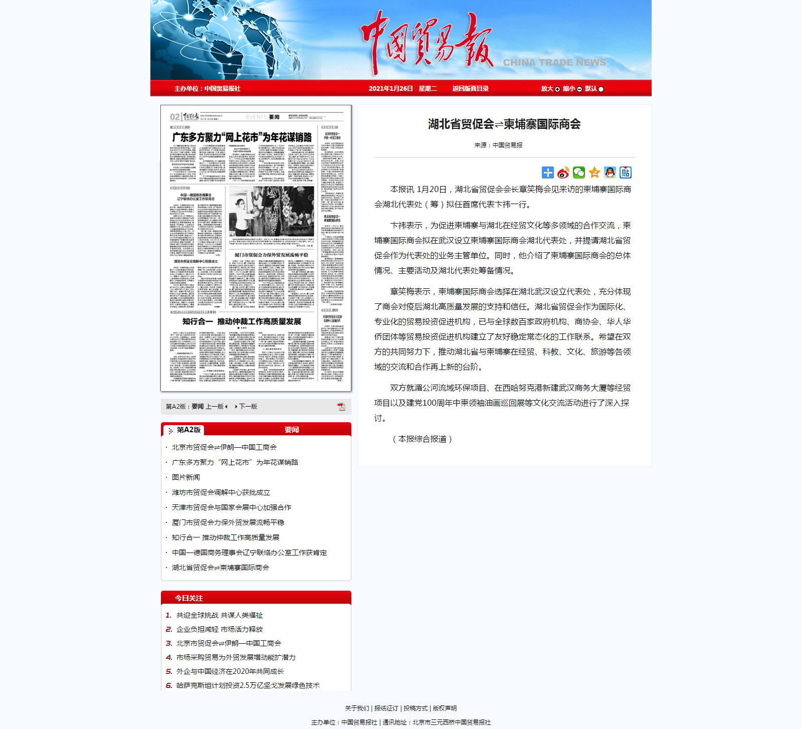 中国贸易报:湖北省贸促会⇌柬埔寨国际商会