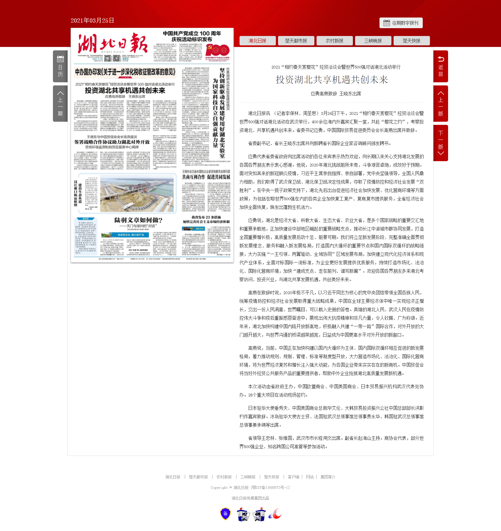 湖北日报:2021“相约春天赏樱花”经贸洽谈会暨世界500强对话湖北活动举行 投资湖北共享机遇共创未来 应勇高燕致辞 王晓东出席