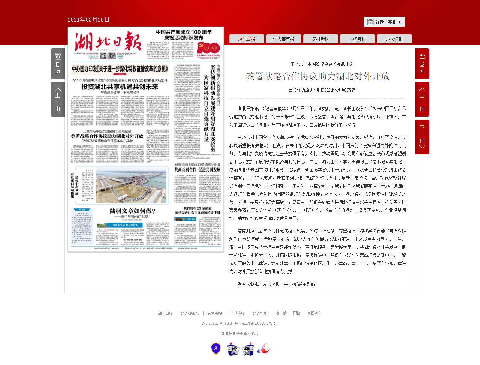 湖北日报:王晓东与中国贸促会会长高燕座谈 签署战略合作协议助力湖北对外开放 营商环境监测和自贸区服务中心揭牌