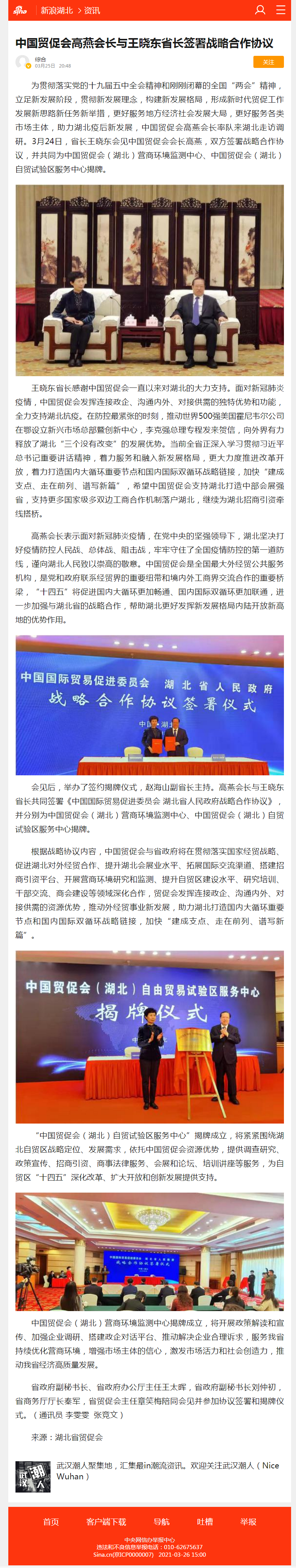 新浪网:中国贸促会高燕会长与王晓东省长签署战略合作协议