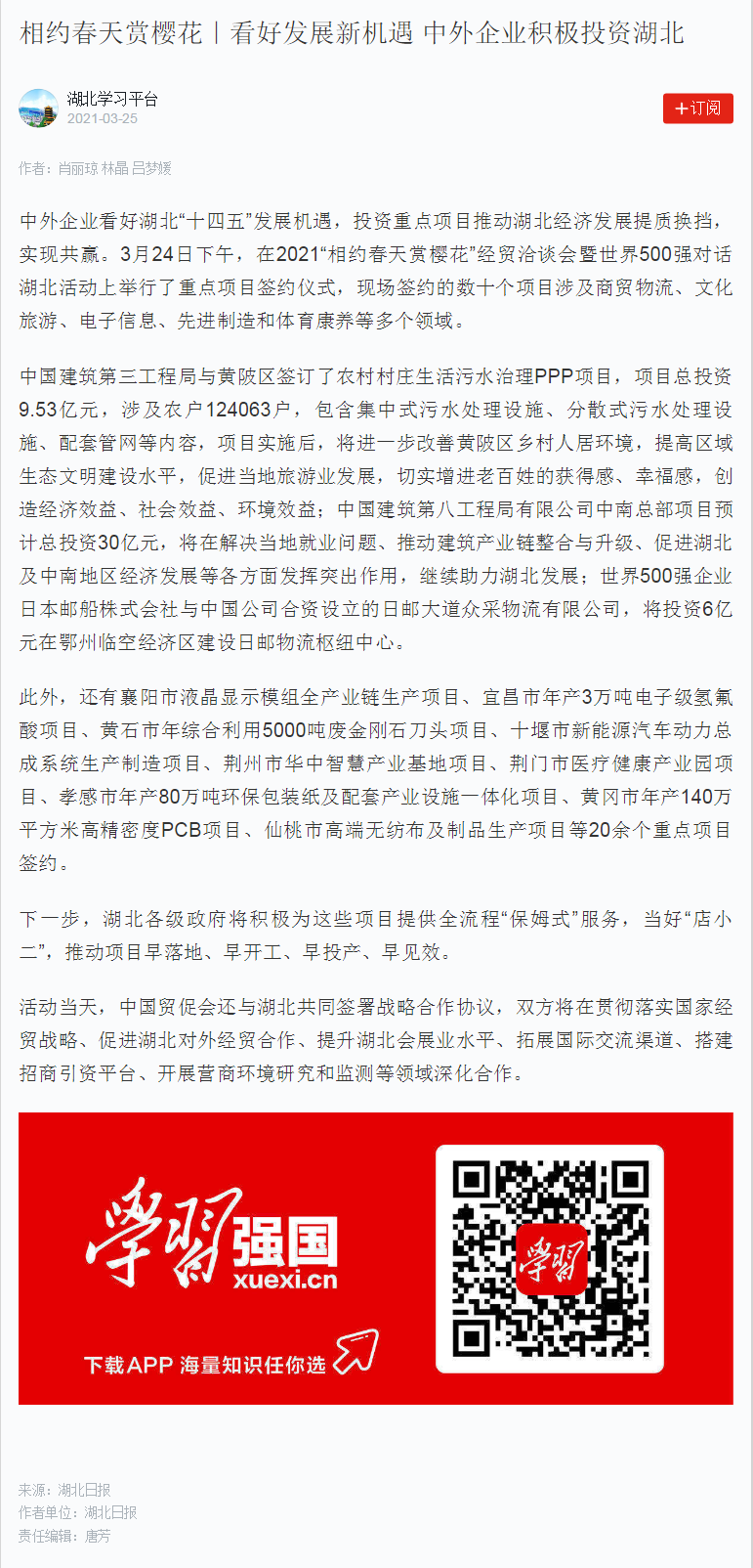 学习强国:相约春天赏樱花|看好发展新机遇 中外企业积极投资湖北