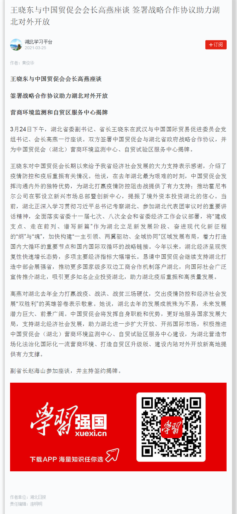 学习强国:王晓东与中国贸促会会长高燕座谈 签署战略合作协议助力湖北对外开放